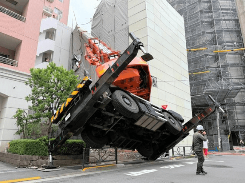 クレーンのブーム部分の歩道が陥没してるようだから単純な作業ミスじゃないかもしれん。