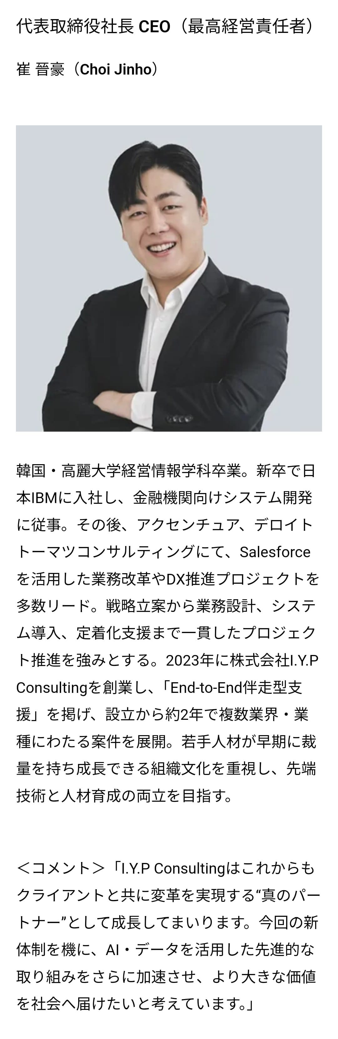 韓国・高麗大学経営情報学科卒業。新卒で日本IBMに入社し、金融機関向けシステム開発に従事。その後、アクセンチュア、デロイトトーマツコンサルティングにて、Salesforceを活用した業務改革やDX推進プロジェクトを多数リード。戦略立案から業務設計、システム導入、定着化支援まで一貫したプロジェクト推進を強みとする。2023年に株式会社I.Y.P Consultingを創業し、「End-to-End伴走型支援」を掲げ、設立から約2年で複数業界・業種にわたる案件を展開。若手人材が早期に裁量を持ち成長できる組織文化を重視し、先端技術と人材育成の両立を目指す。