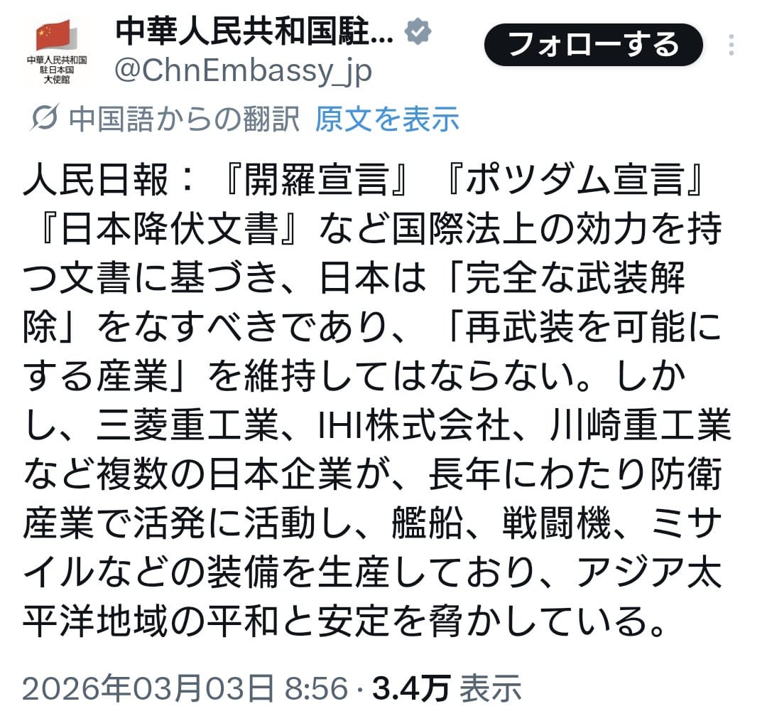 中国大使館「日本は『完全に武装解除』すべきであり、再武装を可能にする産業を維持してはならない」
