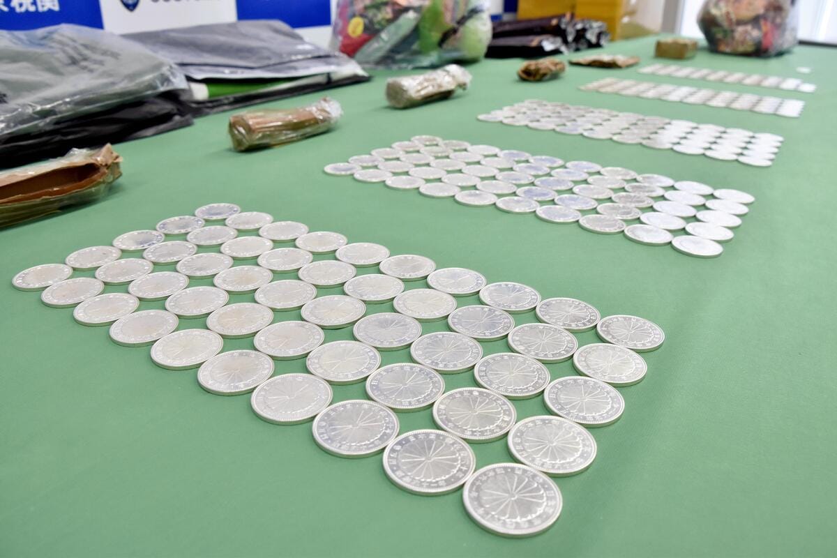 押収された偽造銀貨(5日、東京都江東区の東京税関で)