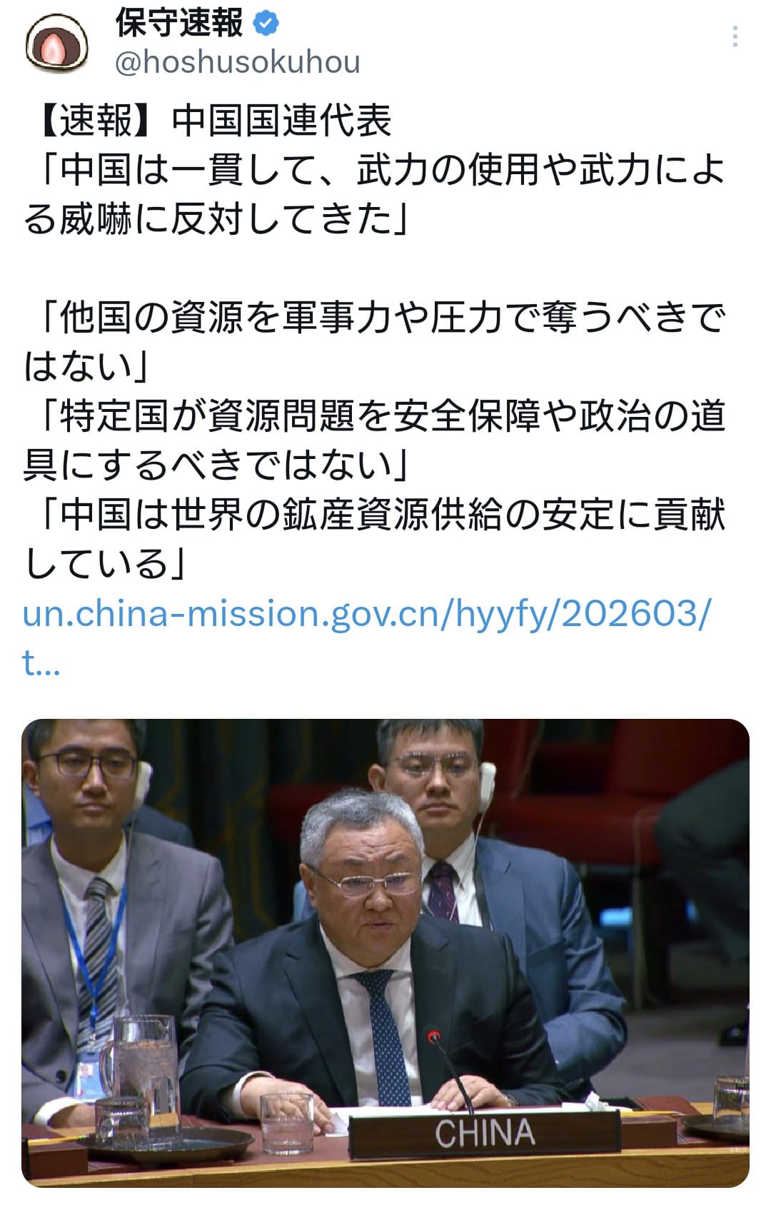 中国国連代表「中国は一貫して、武力の使用や武力による威嚇に反対してきた」