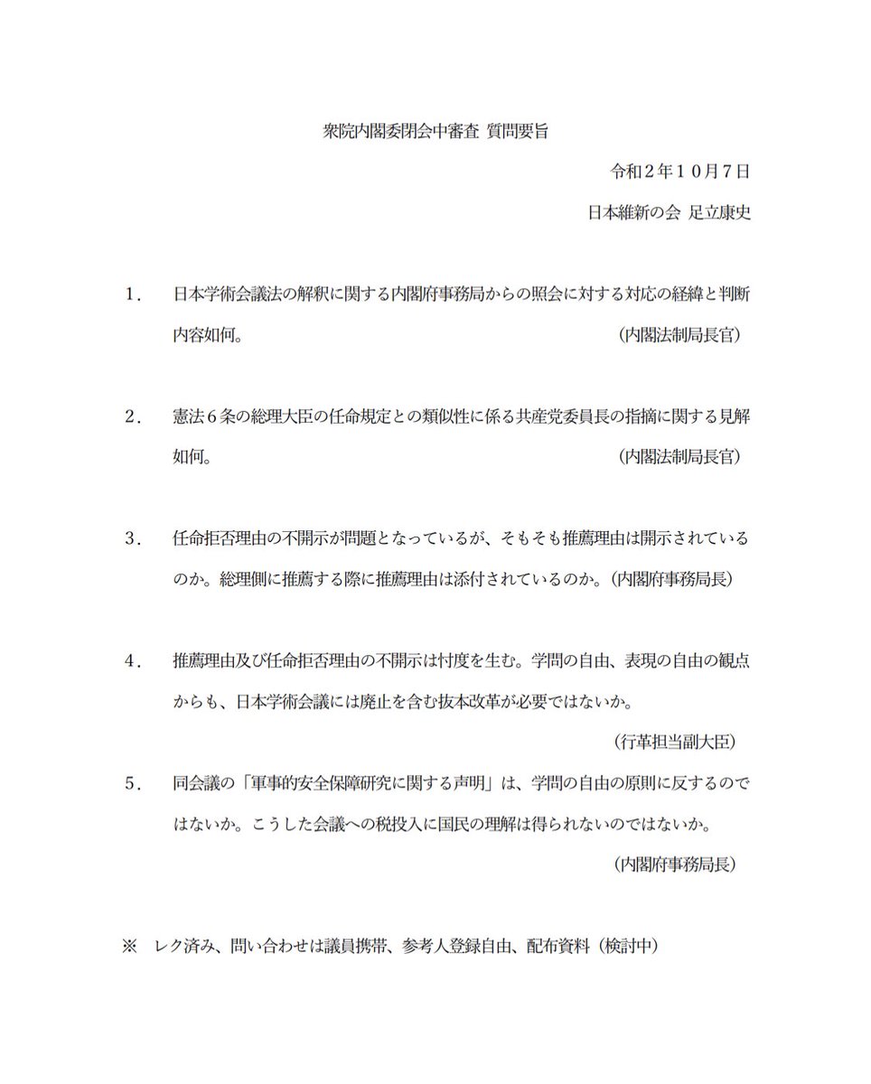 明後日7日の衆院内閣委・閉会中審査の質問要旨を添付します。