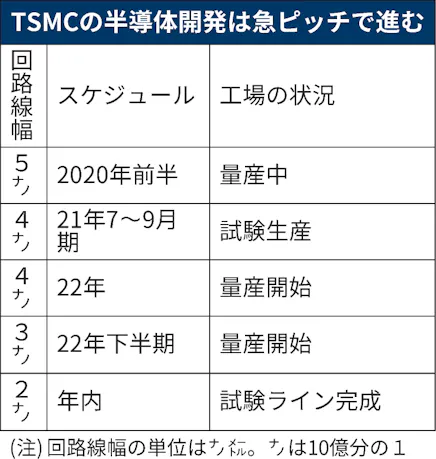 1: HAIKI ★ 2021/06/02(水) 20:58:34.57 ID:CAP_USER半導体世界大手の台湾積体電路製造(TSMC)は2日、回路線幅が2ナノ(ナノは10億分の1)メートルの超先端品となる半導体の試験ラインを年内に完成する計画を明らかにした。量産工場の建設方針も示した。現在主流の先端品の2~3世代先を行く製品で、ライバルの韓国サムスン電子との差をさらに広げ、最先端の半導体市場における独占状態が一段と強まりそうだ…