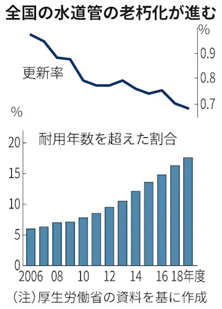 一方で、01年度は1.54%だった水道管の年間の更新率は18年度は0.68%に低下した。人口減少や節水の影響で使用水量が減り、料金収入による独立採算制である水道事業の経営が苦しくなったことが要因の一つだ。