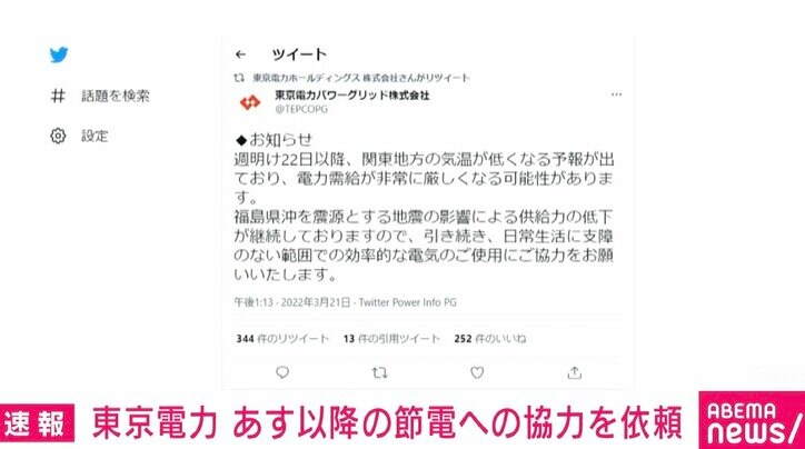 東京電力は一般家庭に対してもTwitterなどで日常生活に支障のない範囲での節電を呼びかけている。