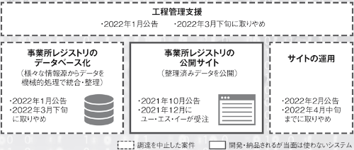 事業所データの整備は住所データの標準化などと並んでデジタル庁でも検討が最も進んでおり、パイロットシステムを構築・運用して整備手法を検証する段階に入ろうとしていた。デジタル庁発足から間もない2021年10月に第1弾の調達を公告し、2022年2月にかけて合計4件のシステム調達案件で参入ベンダーを募集していた。