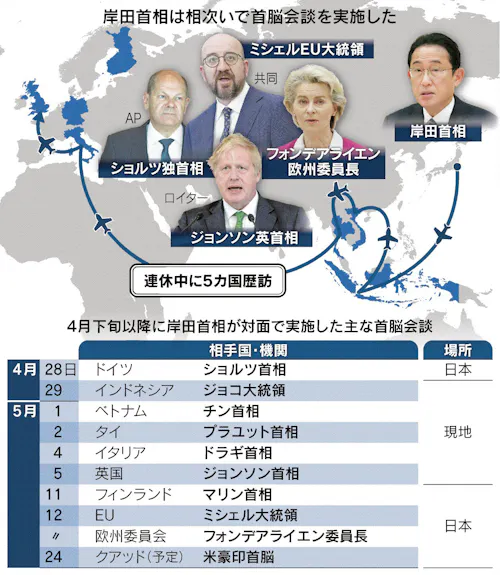 https://www.nikkei.com/article/DGKKZO61017040S2A520C2TCS000/今週は東京があわただしい。日米の首脳が会談し、日米豪印の4カ国の協力枠組み「クアッド」の首脳会議が開かれる。米国主導の「インド太平洋経済枠組み(IPEF)」発足に合わせた参加国とのオンライン会議も開く。振り返っておきたいのは、欧州の首脳も4月以降、相次いで来日していることだ。