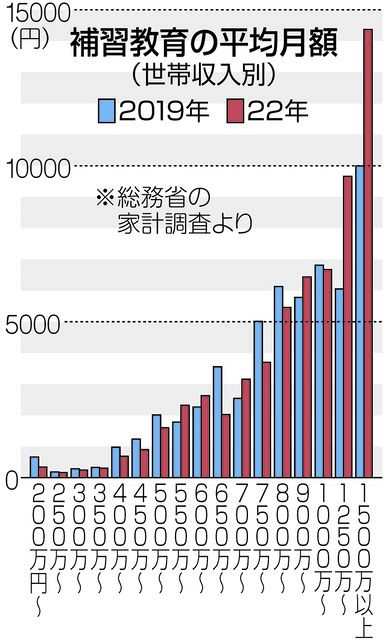 コロナ禍や物価高で家計が厳しくなる中、子どもたちの教育格差が広がっている。総務省の2022年の家計調査によると、塾代など「補習教育」の費用がコロナ前の19年と比べ、年収が多い世帯では増加したのに対し、比較的少ない世帯では減少する傾向が出ていた。物価の高騰が収まらない中で、識者らはさらに格差が拡大することを懸念する。 (並木智子)