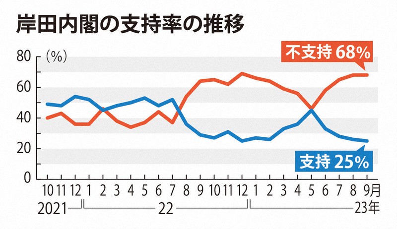 岸田内閣の支持率は、マイナンバーカードを巡るトラブルが相次いだことなどが影響し、6月以降、下落に転じた。8月から横ばいとなっているが、7~9月の3カ月連続で30%を切るなど厳しい状況が続いている。