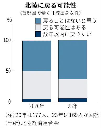 北陸経済連合会は30日、女性の就業意識に関する調査の結果を発表した。首都圏(東京、埼玉、千葉、神奈川)で働く北陸出身の女性(169人)の63%が「北陸に戻ることはない」と考えていることがわかった。20年に実施した調査から14ポイント増えた。北経連は行動制限の緩和で、首都圏の方が生活面で楽しめると考える人が多いとみている。