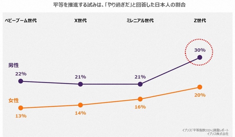https://mainichi.jp/articles/20240823/k00/00m/040/129000c平等の推進は「やり過ぎ」と回答した世代・男女別の割合=イプソスの資料から